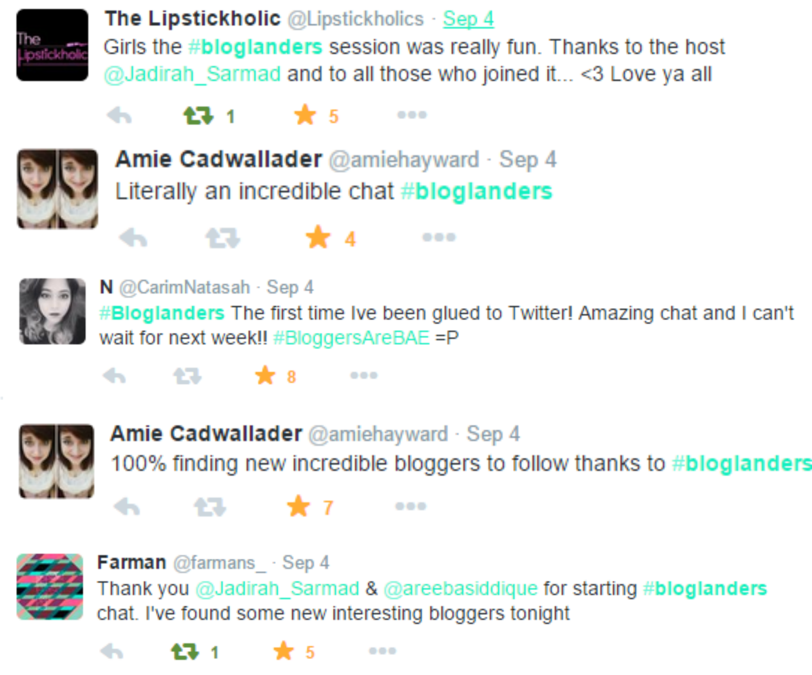 Then around Nov/Dec, Areeba and I discussed that we really do not get to see much of Pakistani bloggers on Twitter and even if we do have a huge active group of local Twitterati, we don’t see them interacting as such with bloggers from the other parts of the world. This was the ice that we thought had to be broken as we would like to see our own local blogging community gaining international recognition. Hence, for months the idea of our own Twitter chat had been in the pipelines and late in July we retouched upon the issue. Then thanks to Noor for pushing us for real to get it started and last week was the debut of our own Twitter chat, named #bloglanders. I had invited all my friends to join me for the chat last week and knowing that Areeba had to travel back home earlier than planned, I was kind of nrevous to host all by myself. I have hosted a #PABChat session previously but since #bloglanders is a new born, I did not expect as many people to show up. However, the turnout was great and in no time my feed was flooding, so I am very grateful to everybody who particpated and supported us through and through.