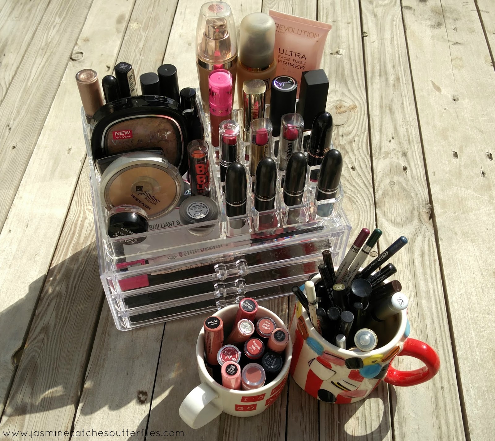 Apart from this makeup organiser, I store my most used, every day, drugstore lipsticks in one mug and all my pencil liners, liquid liners and mascaras in another mug. I keep most of the products upside down so that I know which is which when I have to get ready in a rush.