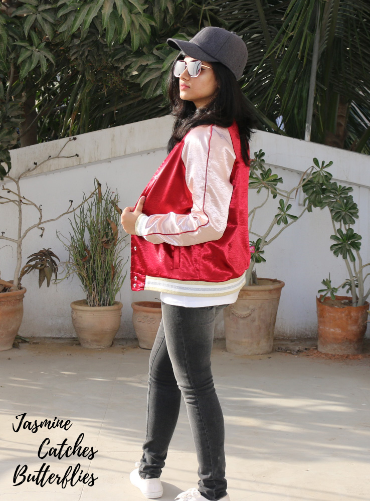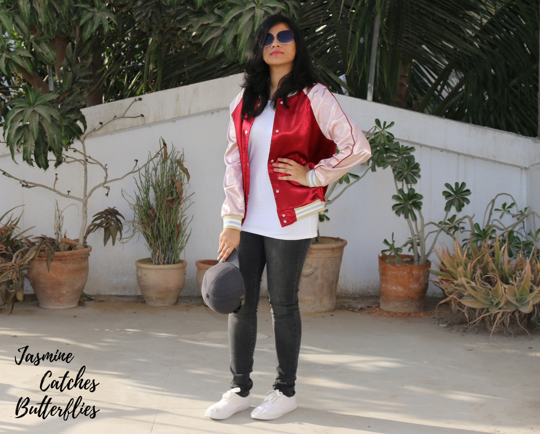A satin jacket of the sort, that speaks for itself, is not at all difficult to style. In order to achieve a cute but trendy look, all you need to do is keep everything else basic and preferably monochrome. Therefore, in order to style this popping wine red baseball jacket, I paired it with a plain white tee shirt, dark grey skinny jeans, a similar grey baseball cap and a pair of white tennis shoes. You can totally wear white sneakers too!