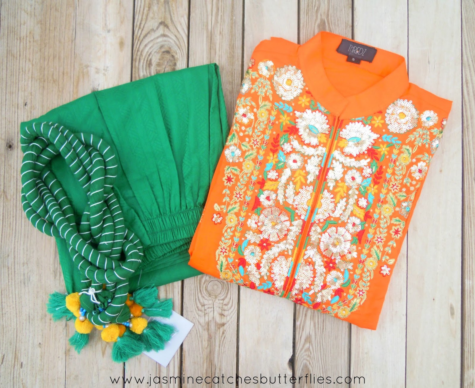 As far as Eid dresses are concerned, I had bought one from Thredz a couple months back which I will show you in another post and that was supposed to be my main Eid outfit. Other than that I got a few kameez shalwars and tradition outfits stitched for other days of Eid and Jumma-tul-Wida so I had no intention of purchasing any more clothes for this Eid. However, my brother had to buy his Eid clothes and we were in Thredz when I spotted this embroidered kurta that looks very desi. Orange is not even a colour that I usually gravitate towards but for some reason I found this attractive with a strong cultural vibe. I had skipped buying it for the night but went to another branch the next day and at last bought it with matching green printed pants and crinkled dupatta with yellow tassels. So now both of my main Eid dresses are from Thredz which I don’t mind because I find Thredz to be one of my favourite places to shop at as there is always something that I like and it is not even as common unlike Khaadi and others. I did not buy a matching pair of shoes as I already do have a couple that would go with this outfit.