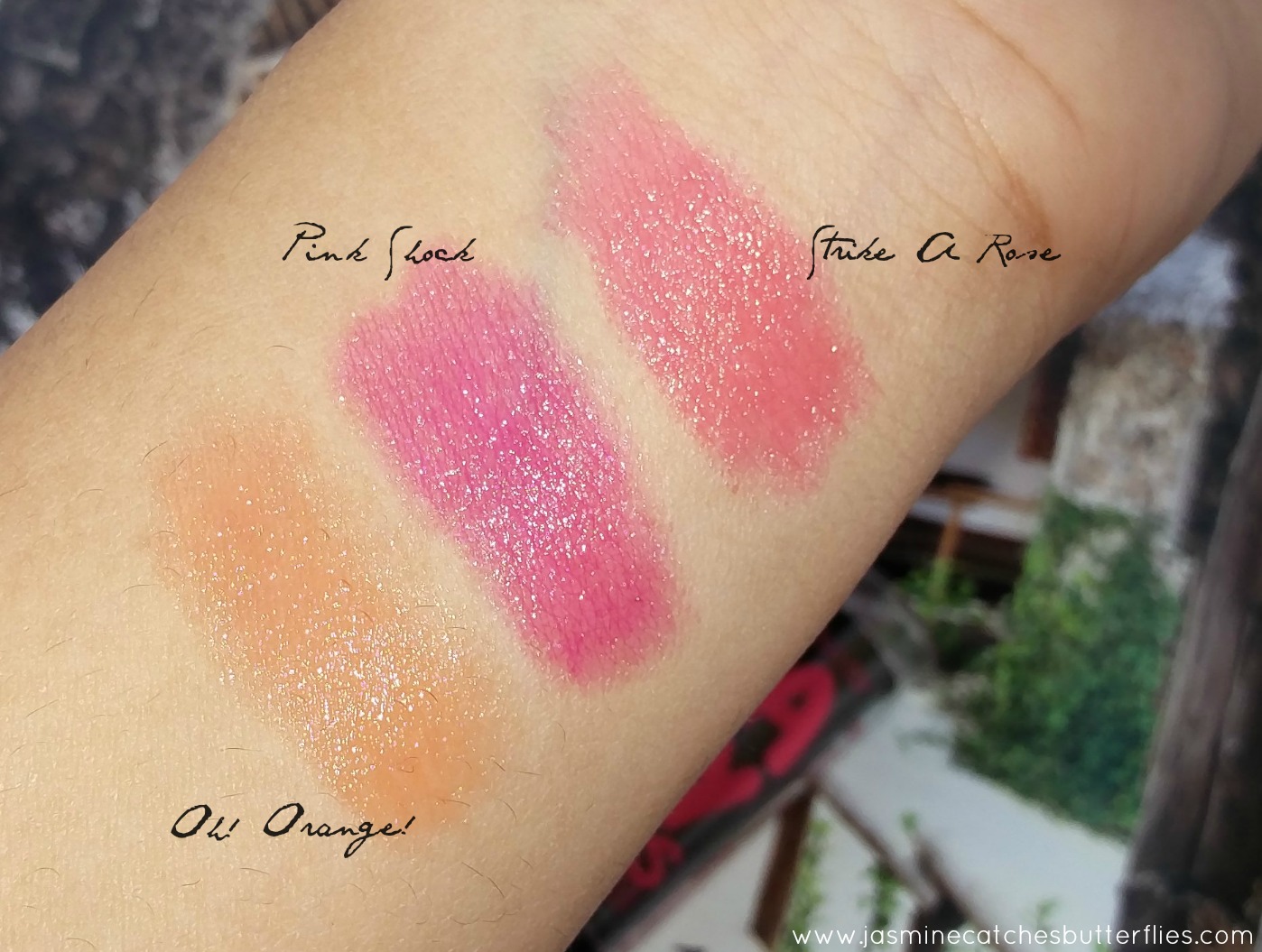 Oh! Orange! as the name suggest is a true bright orange shade with the scent of an orange which I love. Pink Shock is a hot pink and it smells fruity too. While Strike A Rose is a barbie pink that looks really cute and this has a faint floral scent. I do not have any shade favourites as I love them more for moisturising my lips than wearing them for a makeup look. You do not have to worry about the scent if you are someone who does not really like scented products as it is not bothersome and goes away soon after application of the lip balm.