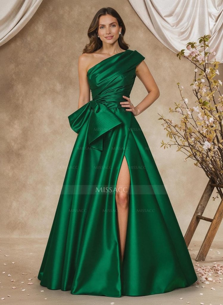 A-Line One-Shoulder Sleeveless Satin Dresses With High Split