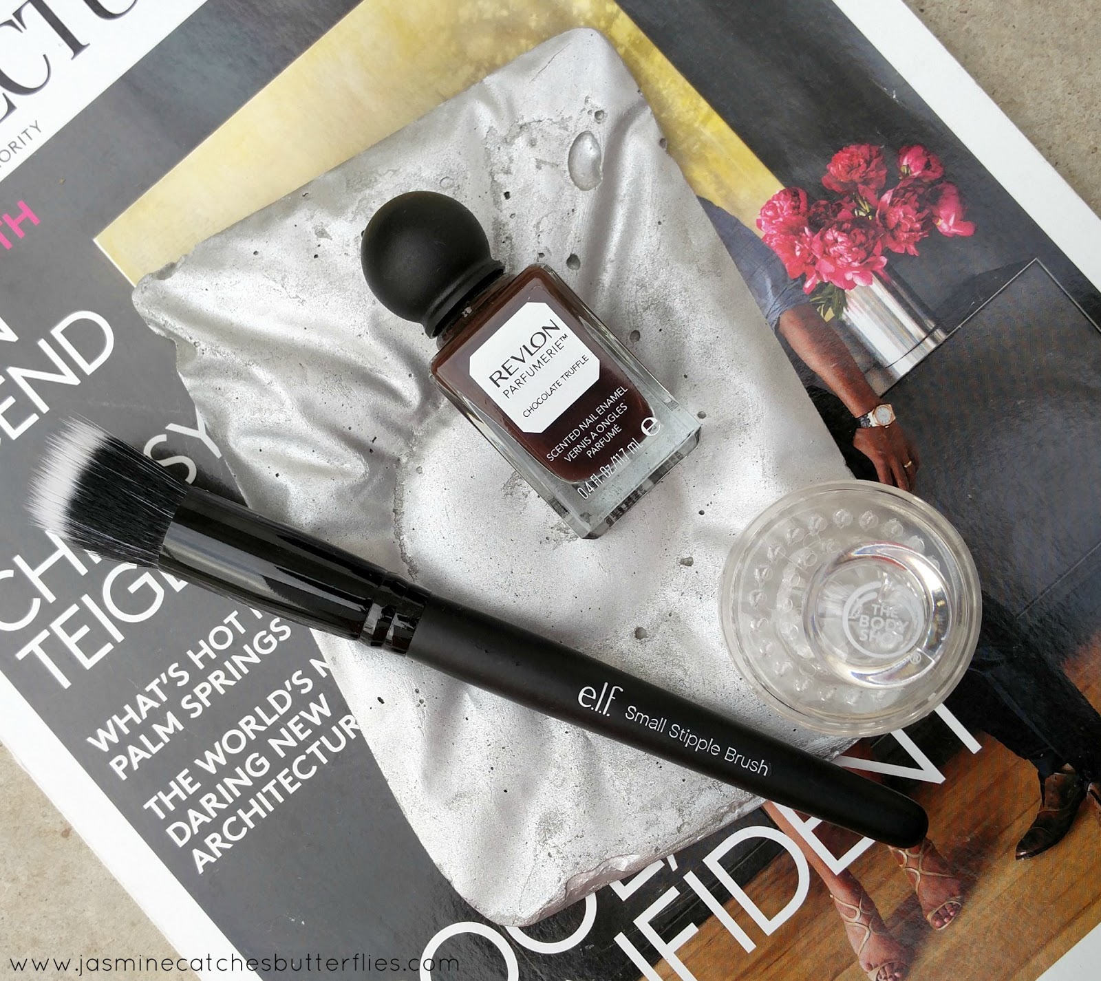 I ended up picking three random bits for myself which include E.L.F Small Stipple Brush, Revlon Parfumerie Scented Nail Enamel in Chocolate Truffle and The Body Shop Facial Brush With Lid. Now, I have only been using these for a few days so I can give you an opinion based on the first impression I have had so far.
