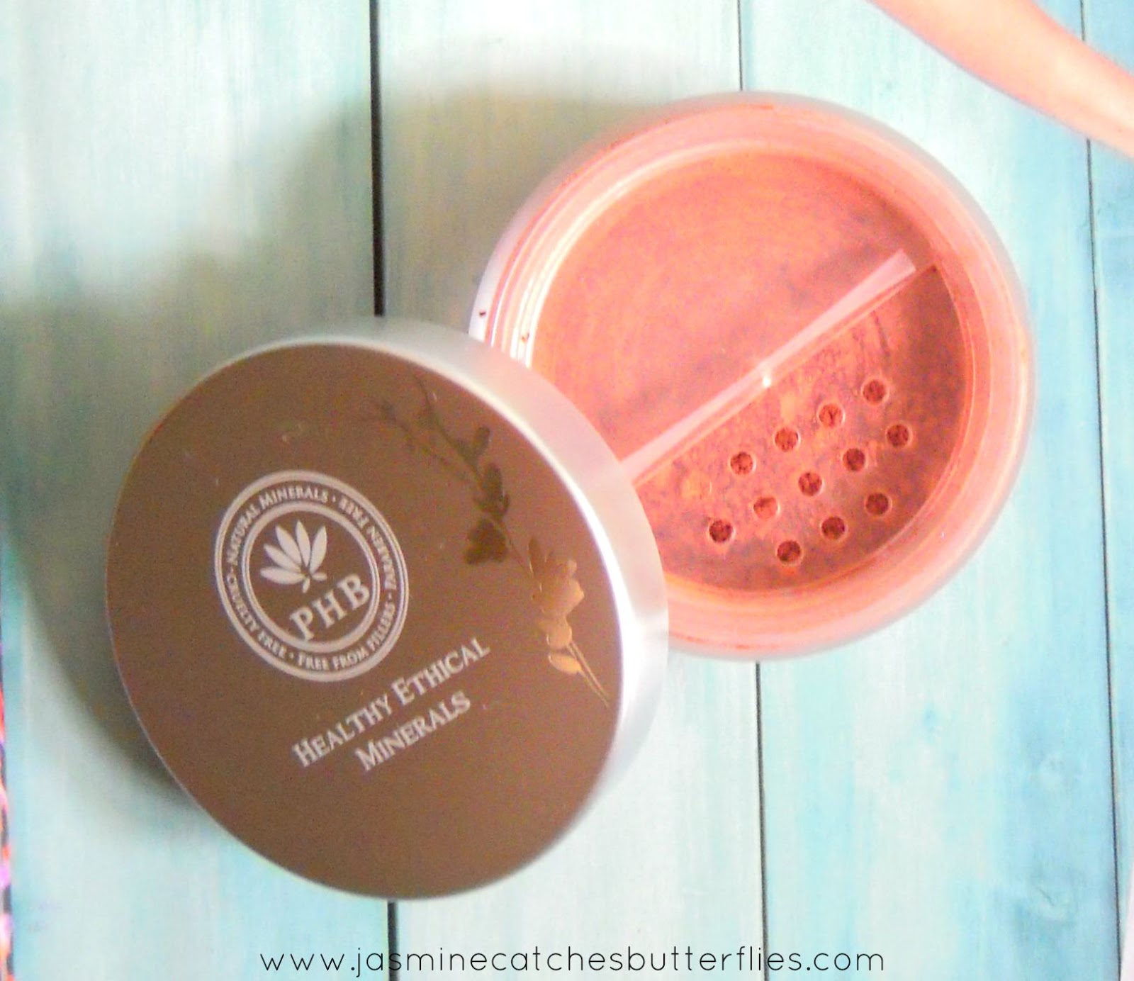 Just like the foundation, the blusher also comes in a similar plastic jar with a silver lid and sifter but it is smaller in size with 5g of product. The shade Warm Apricot is aptly named as it is a beautiful deep pinky red shade which would flatter medium to darker skin tones. Pigmentation wise this is an absolute winner, but again you do not want to load too much on at once. A little goes a long way and you can gradually build it up. I say this because it is not the easiest to blend blusher but that also makes it more long lasting and prevents fading. PHB Mineral blusher also has an SPF15 to protect your cheeks against sun damage.