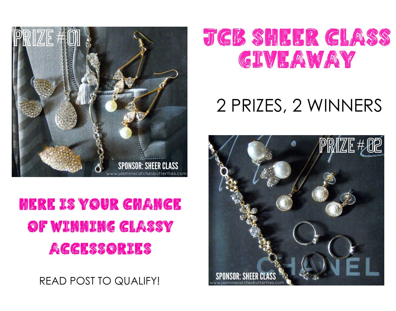 So thanks to Sheer Class, you guys have two prizes up for grabs and hence there will be two randomly drawn winners! To enter head over to my Facebook page and follow the instructions. You just have to like our pages, that is Jasmine Catches Butterflies and Sheer Class and leave a comment there telling us which type of jewelry do you like the most. You can earn bonuses mentioned on Facebook. The giveaway is only open to Pakistani residents and will end on 28th February 2016 at 11:59 PM.